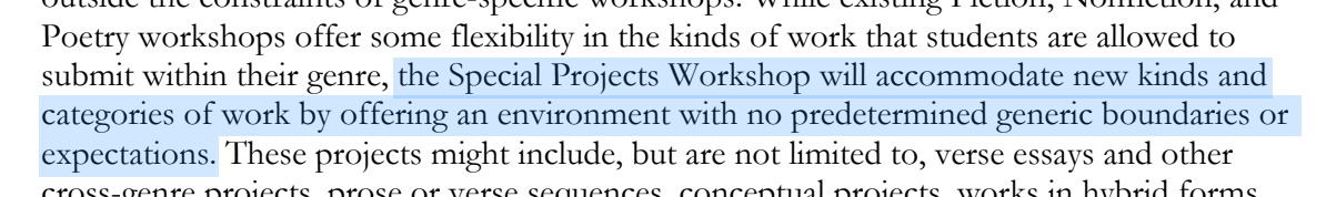 The Special Projects Workshop was a course where students could pitch their own projects and were encouraged to think outside of non-traditional forms and genres.